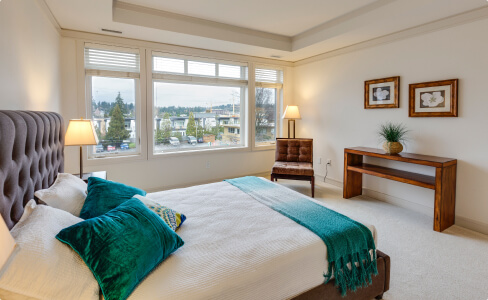 Luxe with private balcony for 2-4 persons, 54 m², oversized bathroom with deep soaker tub, separate walk-in shower and double sink vanity, separate toilet, spacious walk-in closet, bedroom and divided living area with comfortable sleeper sofa bed